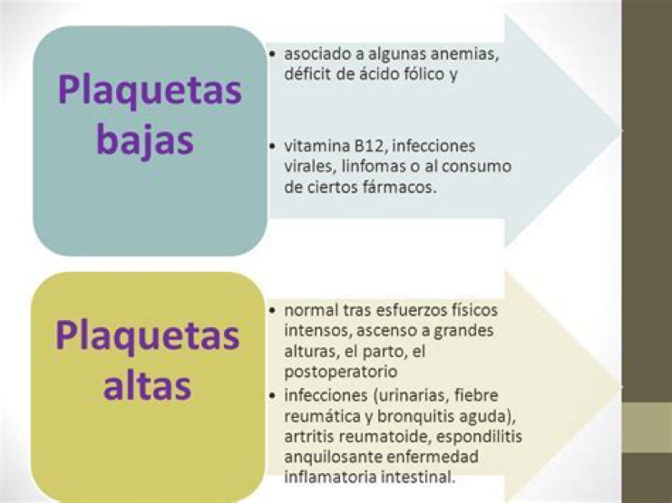 Niveles bajos: el recuento plaquetario inferior a lo normal es lo que se conoce como trombocitopenia. Puede deberse a un acúmulo anormal de plaquetas en el bazo o a una mala función de la médula ósea. Tiene como consecuencia la mala coagulación